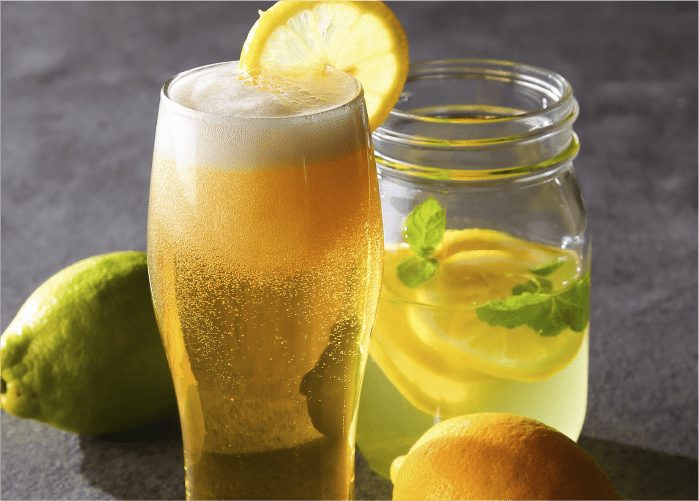 冷えたビールに甘酸っぱいレモネードを加えた、レモンビール。おしゃれなグラスにカットレモンやミントを添えて。